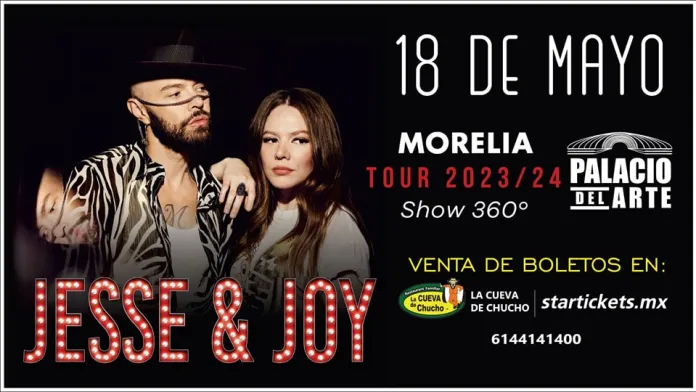 El dúo musical Jesse & Joy se presentará el 18 de mayo en punto de las 21:00 horas, marcando así su regreso por segundo año consecutivo con una propuesta única en formato 360º en el Palacio del Arte, prometiendo emocionar y hacer vibrar al público moreliano. La información se dio a conocer el pasado miércoles 6 de marzo, donde se llevó a cabo una conferencia de prensa para anunciar con entusiasmo el próximo concierto de Jesse & Joy en la capital de Michoacán.
